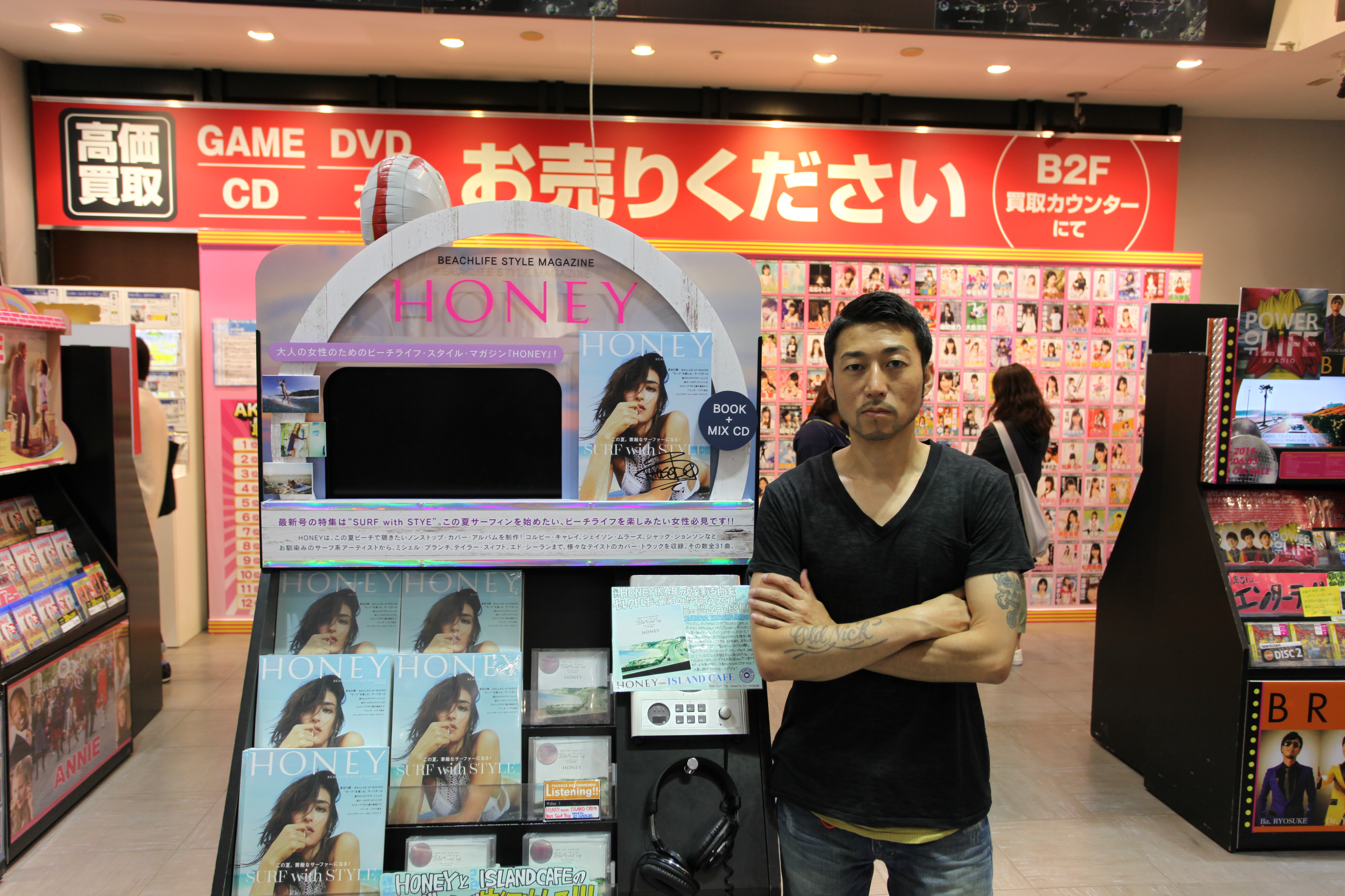 先行発売日当日にDJ HASEBEがSHIBUYA TSUTAYAを訪問「HONEY meets ISLAND CAFE 〜Best Surf Trip〜 mixed by DJ HASEBE」コーナーでサイン&ポーズ!