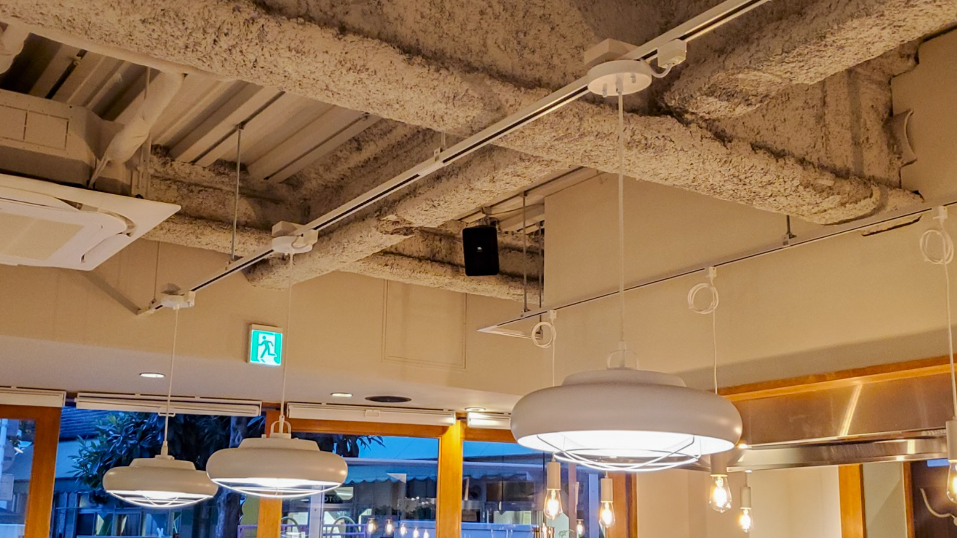 音響システムは、入り口と店内でゾーニングし、エリア毎での音量調整を可能にしました。エリア毎にスピーカーのデザインも変更し、インテリアとのマッチングを考慮した音響システムを構築しました。
