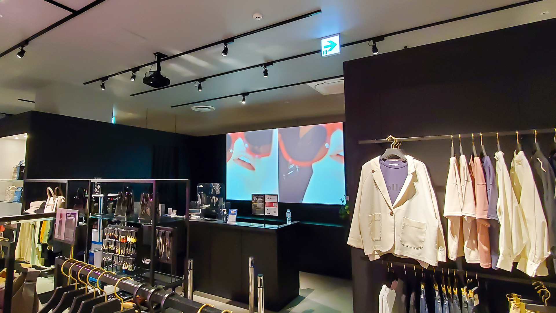 レジカウンター後ろの壁面へ約120インチの映像を投影できるプロジェクターを導入しました。視認性を高めるため、輝度が高い単焦点モデルの機種を選定しており、店内のお客様はもちろん、店外にいてもAZUL BY MOUSSYの世界感を体感できます。