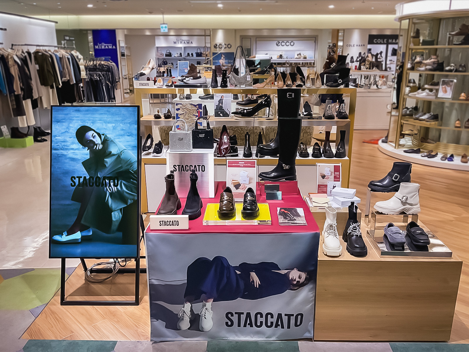 秋冬の新作アイテムを中心に、STACCATOで大人気のプラットフォームローファーや、モードなデザインスニーカー、またシックでアーバンなショート&ロングブーツまで、トレンド感あふれるエッジの効いたシューズをバリエーション豊富に取り揃えています。秋冬らしい季節感を楽しめるシューズを展開している、STACCATO新潟伊勢丹店のデジタルサイネージをプロデュースしました。